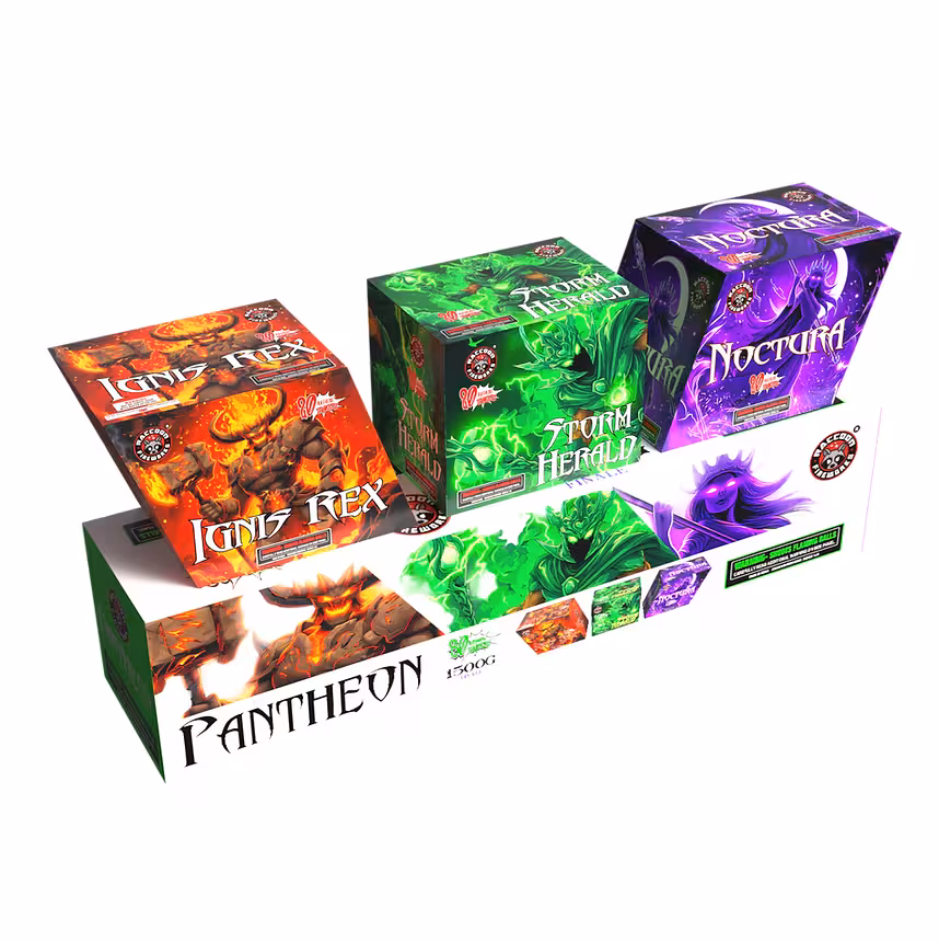 Orange mines to orange peony on the left; purple mines to purple peony on the right; green mines to green peony in the middle. 60 shots. Case of 3 units.