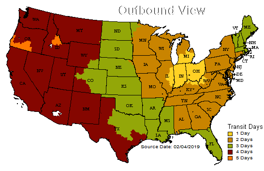 UPS Transit Map for packages shipped from Bluffton, OH.